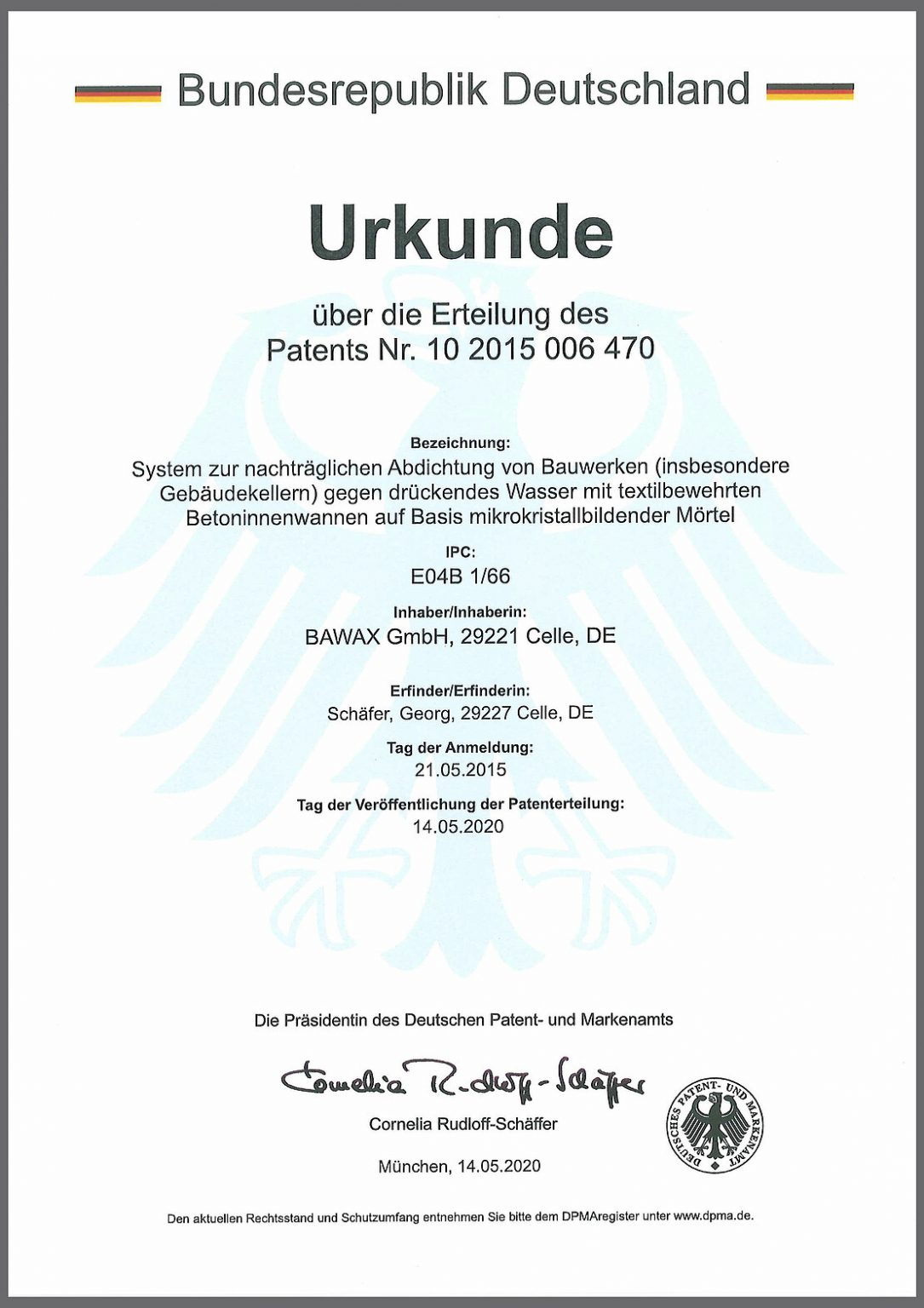 Patent für ein „System zur nachträglichen Abdichtung von Bauwerken (insbesondere Gebäudekellern) gegen drückendes Wasser mit textilbewehrten Betoninnenwannen auf Basis mikrokristallbildender Mörtel“.